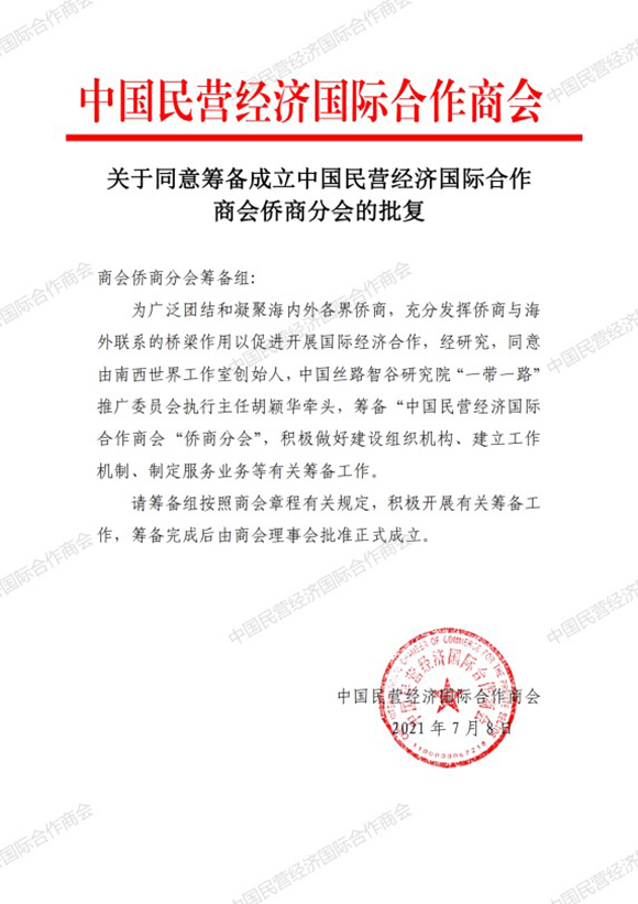 “中國民營經(jīng)濟(jì)國際合作商會僑商分會”批復(fù)文件
