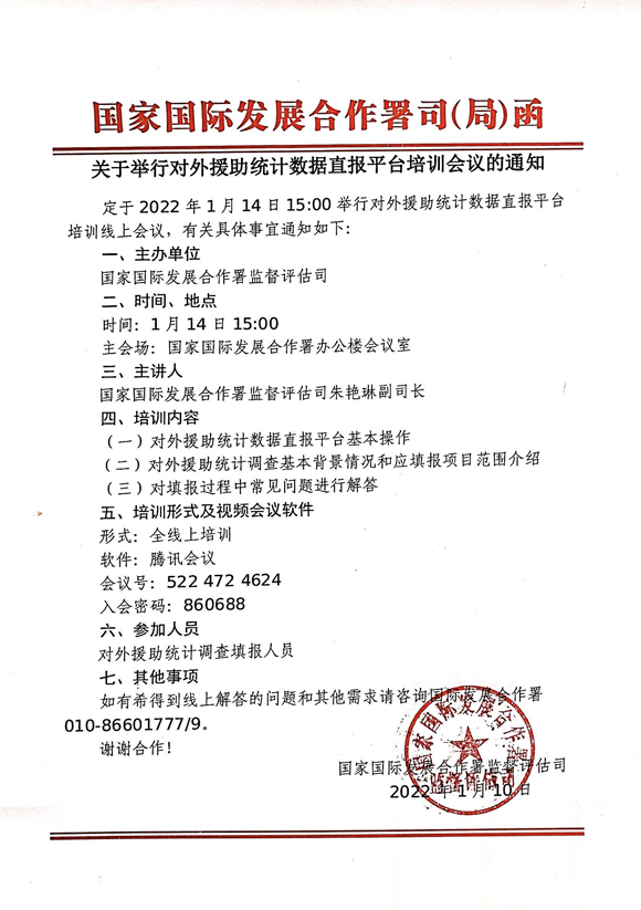 服務(wù)您的熱線:010-84647718 我們恭迎您的來電!國家國際發(fā)展合作署《關(guān)于舉行對外援助統(tǒng)計數(shù)據(jù)直報平臺培訓會議的通知》