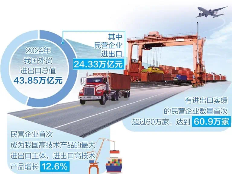2024年,我國(guó)外貿(mào)進(jìn)出口總值達(dá)43.85萬(wàn)億元,其中,民營(yíng)企業(yè)進(jìn)出口24.33萬(wàn)億元。民營(yíng)企業(yè)已連續(xù)6年穩(wěn)居我國(guó)第一大外貿(mào)經(jīng)營(yíng)主體,2024年更實(shí)現(xiàn)新突破:有進(jìn)出口實(shí)績(jī)的民營(yíng)企業(yè)數(shù)量首次超過(guò)60萬(wàn)家,達(dá)到60.9萬(wàn)家;首次成為我國(guó)高技術(shù)產(chǎn)品的最大進(jìn)出口主體,進(jìn)出口高技術(shù)產(chǎn)品增長(zhǎng)12.6%。民營(yíng)企業(yè)逐漸做大做優(yōu)做強(qiáng),為全球貿(mào)易發(fā)展不斷注入活力。