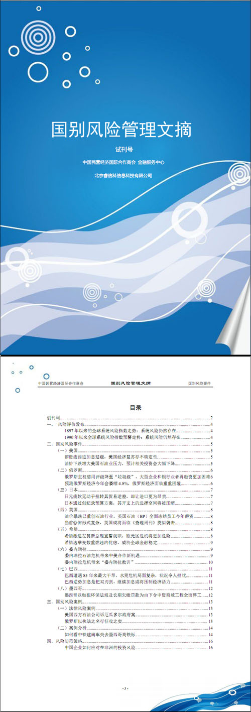 中國企業(yè)“走出去“遇到的首要棘手問題是對國別風(fēng)險的認(rèn)識和理解,為幫助企業(yè)全面地熟悉和認(rèn)識不同國家的國別風(fēng)險,金融服務(wù)中心聯(lián)合相關(guān)組織適時編撰了《國別風(fēng)險管理文摘》,以供會員企業(yè)及時掌握國際風(fēng)云變換,了解投資目的國政治,經(jīng)濟(jì),文化,法律,稅務(wù)等一系列與企業(yè)經(jīng)營相關(guān)的問題,幫助企業(yè)及時恰當(dāng)?shù)墓芾砗脟H化經(jīng)營中的各種風(fēng)險。“文摘”以大數(shù)據(jù)和定量評分模型為基礎(chǔ),幫助會員企業(yè)把控海外投資的機(jī)遇和風(fēng)險,對全球風(fēng)險跟蹤預(yù)警。我們懇切的希望廣大會員單位熱情地關(guān)注我們,坦誠地幫助我們,使我們的刊物真正發(fā)揮風(fēng)向標(biāo)的作用,為廣大民營企業(yè)實施“走出去”戰(zhàn)略保駕護(hù)航。在線瀏覽或點擊下載