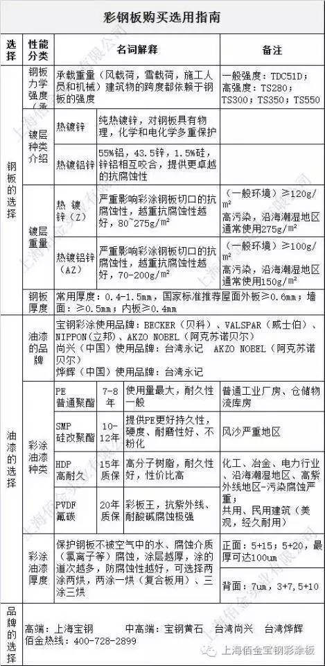 風雪載荷主要是考慮建筑物的安全系數。這盡管和彩鋼板的力學性能有關,但更多的和壓型鋼板的板型、厚度以及板與板之間的連接有關(關于鋼板材料的推薦在發展趨勢中描述)。而定量描述一個地區的腐蝕環境相對困難。影響彩鋼板的腐蝕因素有很多。下面我們具體來了解下彩鋼板購買時的選用指南。